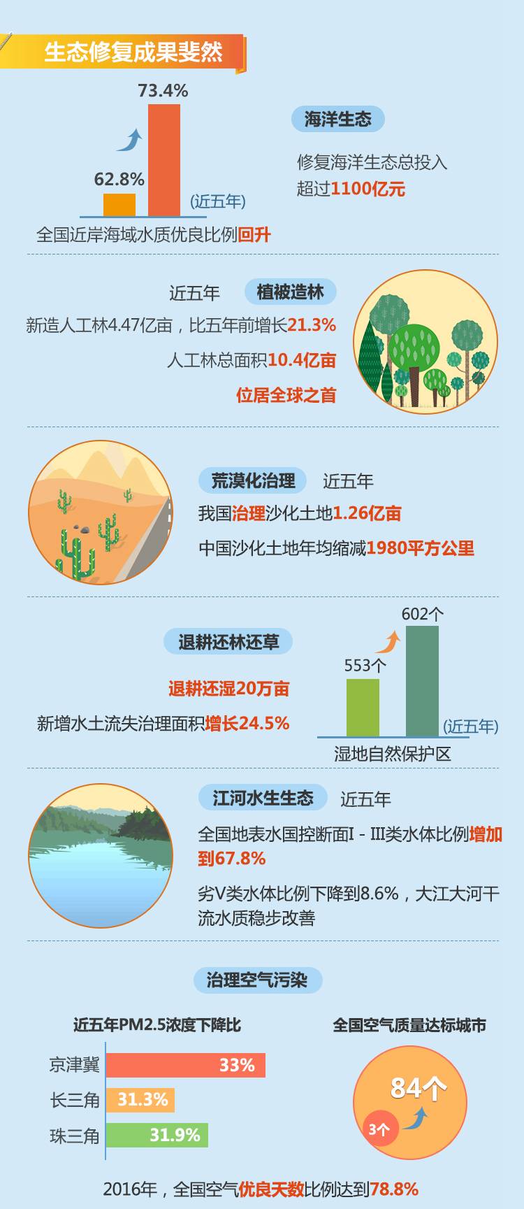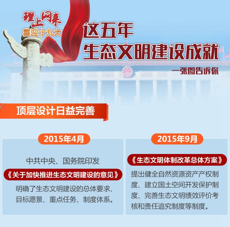 “绿水青山就是金山银山”。这五年来,随着绿色发展理念逐步融入中国人的生产生活,经济发展与生态改善已经实现良性互动,绿色中国新图景正在拉开帷幕。这五年,中国生态文明建设创造出哪些新成绩,下图将为你简略概述: