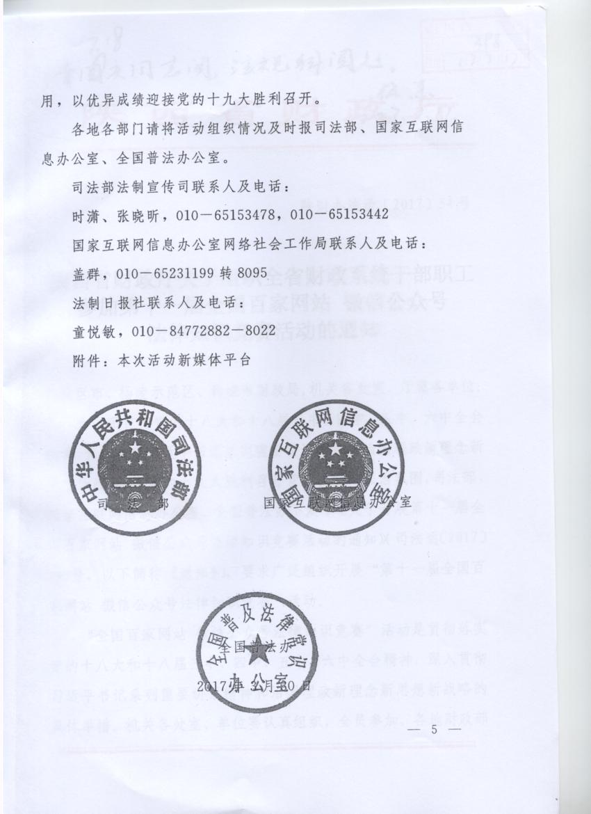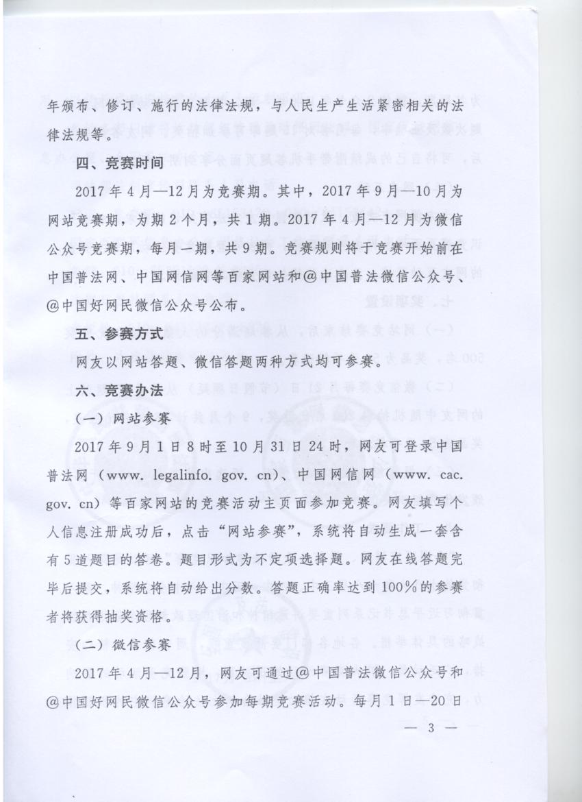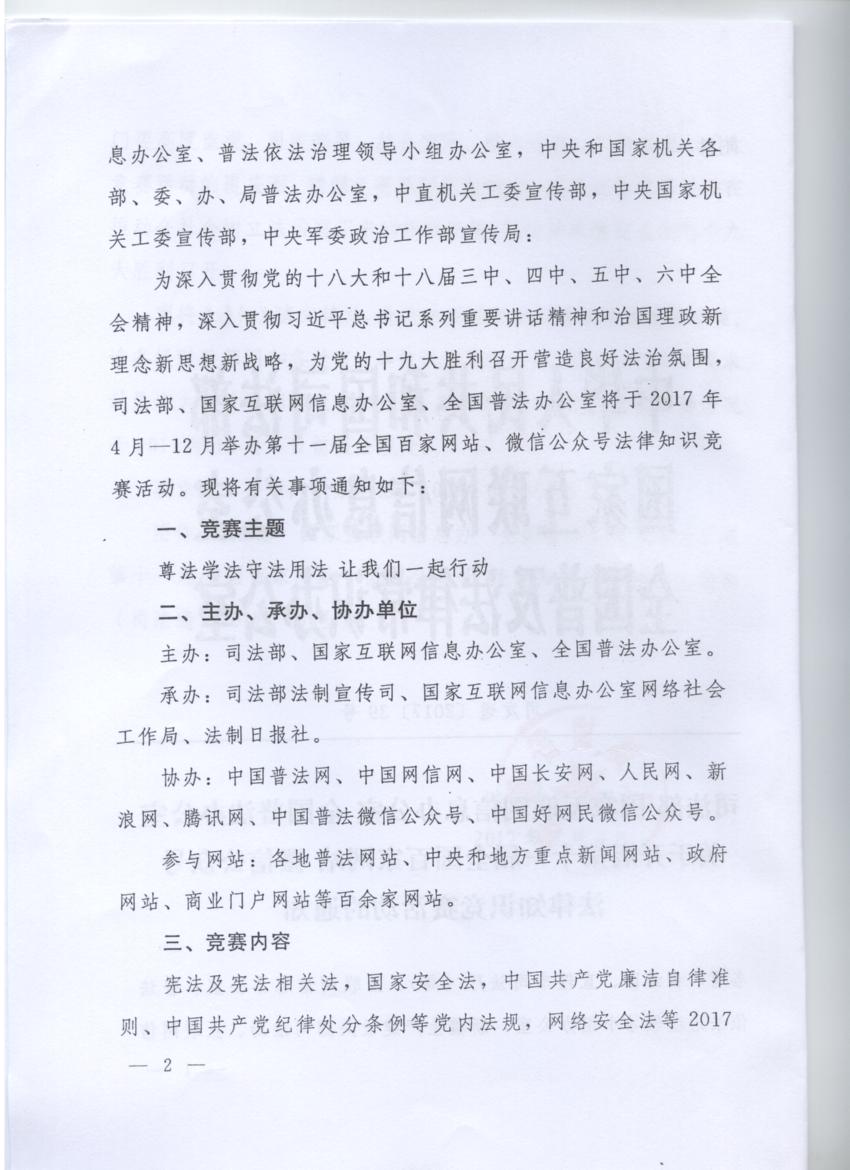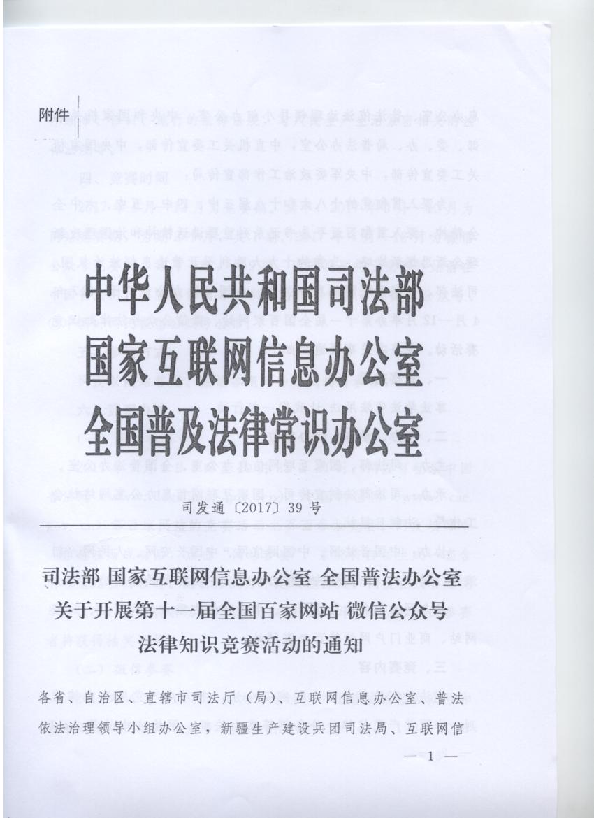 ?附件:司法部 国家互联网信息办 全国普法办公室关于开展第十一届全国百家网站 微信公众号 法律知识竞赛活动的通知(司发通〔2017〕39号)