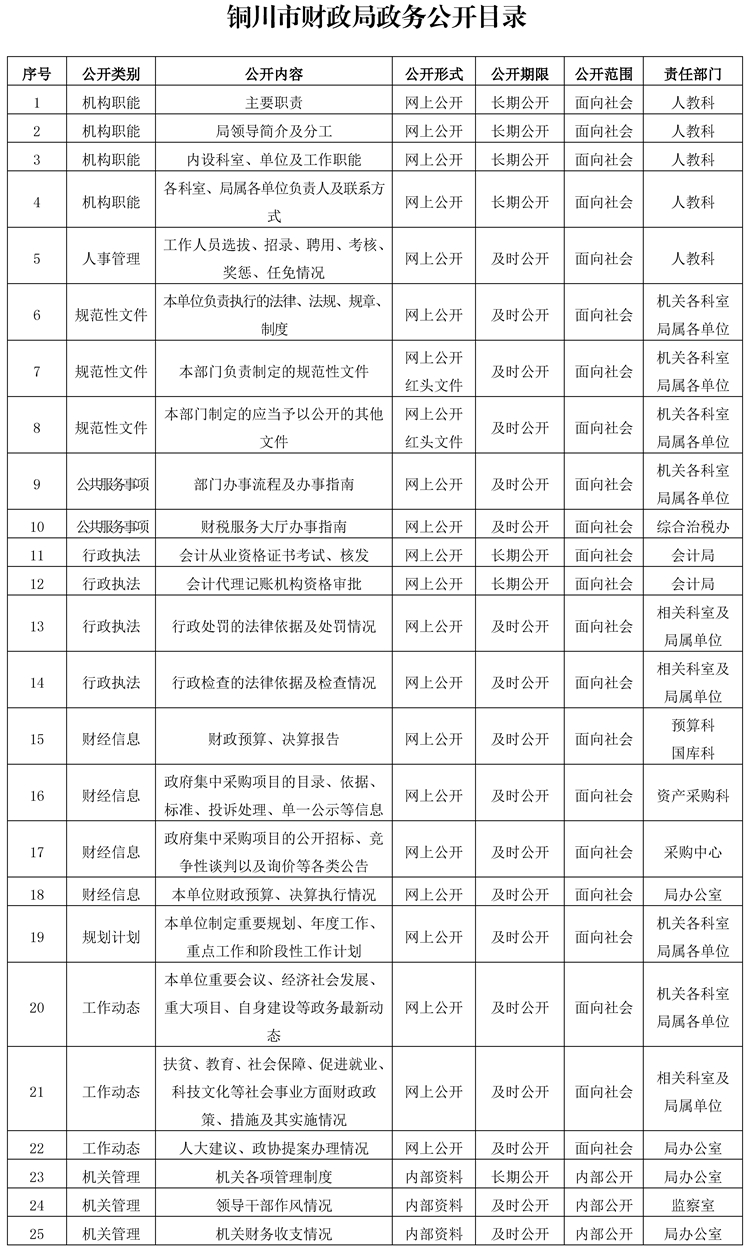 (三)编排体系。《铜川市财政局政府信息公开目录》由索引号、名称、分类、内容概述、生成日期等项目组成。索引是公众查找和获取政府公开信息的代码,索引号由类别码、年份码、流水码组成,市级文件类别码用大写英文字母TC表示,市财政局印发文件类别码用大写英文字母CZ表示,用以区分门户网站新闻类、服务类信息,年份码用数字表示,最后是信息的流水号,用数字表示。信息名称是政府公开信息原文的标题。关键字是介绍政府信息的简要提示。发布日期是政府信息的发布时间。《铜川市财政局政府信息公开目录》在每一类目内按照年度由近及远的顺序排列,每一年度内按1月至12月的顺序排列。
