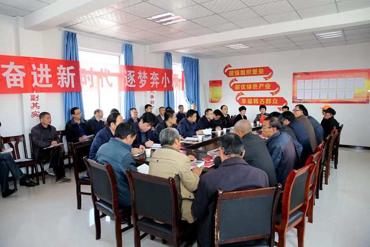 在韩古庄村会议室,杨磊同志同村两委会成员、村支部党员围坐在一起,结合自己学习十九大精神的所思所悟,深刻阐述了党的十九大重大意义和主要精神,并就乡村振兴战略、脱贫攻坚等“三农”问题进行了详细解读。